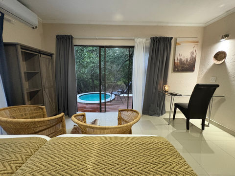Our luxury rooms at the safari lodge are beautifully designed with elegant decor that seamlessly blends comfort and the wild, natural surroundings. Each room offers a unique tranquil retreat, allowing guests to relax in style while immersing themselves in the beauty of the savannah. One of the highlights is the outdoor shower experience, where you can enjoy a refreshing shower beneath the open sky. The Luxury Family Room is larger and is equipped with a bunk bed.